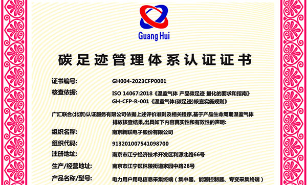 近日,新联电子电力用户用电信息采集终端(集中器、能源控制器、专变采集终端)系列产品顺利通过认证专家组审核,获得碳足迹管理体系认证证书。本次认证依据ISO14067:2018《温室气体产品碳足迹量化的