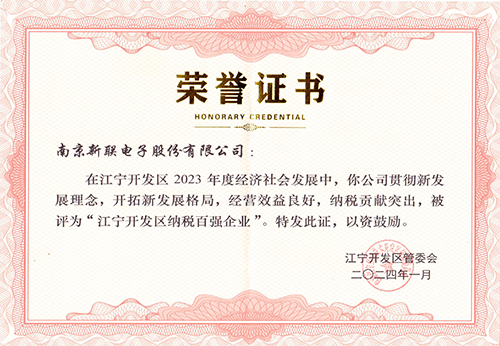 近日,南京新联电子股份有限公司收到江宁开发区管委会下发的2023年度“江宁开发区纳税百强企业”荣誉证书,获此殊荣是对新联电子经营效益以及为地方经济建设做出贡献的肯定和认可。